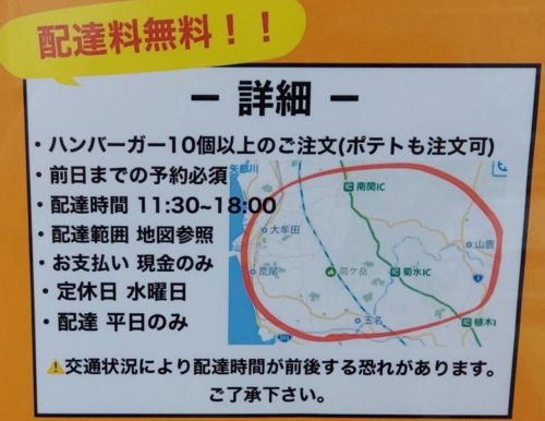 国道208号線を植木町から玉名方面へ向かっていると、玉東町役場を超えてすぐの右側にたっくんバーガーの店舗があります。