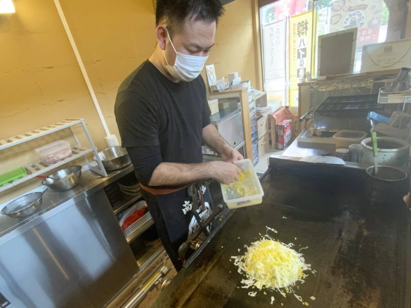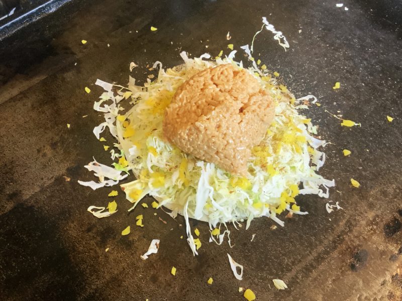 早速、ライス焼きを焼いてもらいましょう!まずは鉄板でお好み焼きを焼く感じで生地と野菜が焼かれていきます。