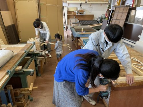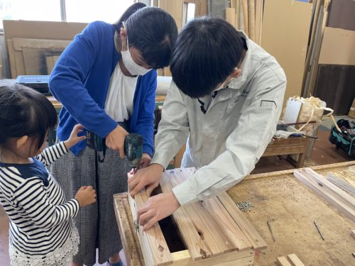 不器用な私が、必死にネジを打ち込んでいく後ろで、わが子はかんな屑を引っ張り出してお姉さんと遊んでいるという、この温度差…