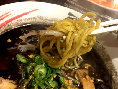 大量の黒マー油が入ったイカスミのような黒いスープはインパクト大!ニンニクもたくさんかけられており、まるで濃厚な豚骨ラーメンかと思わせるほど。でもこれは見た目と裏腹に醤油ラーメンなのです。