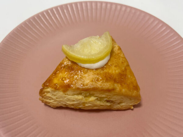 生地にレモンピールが練り込んであるスコーンです。スコーンの上にも大きくカットされたレモンが乗っています。