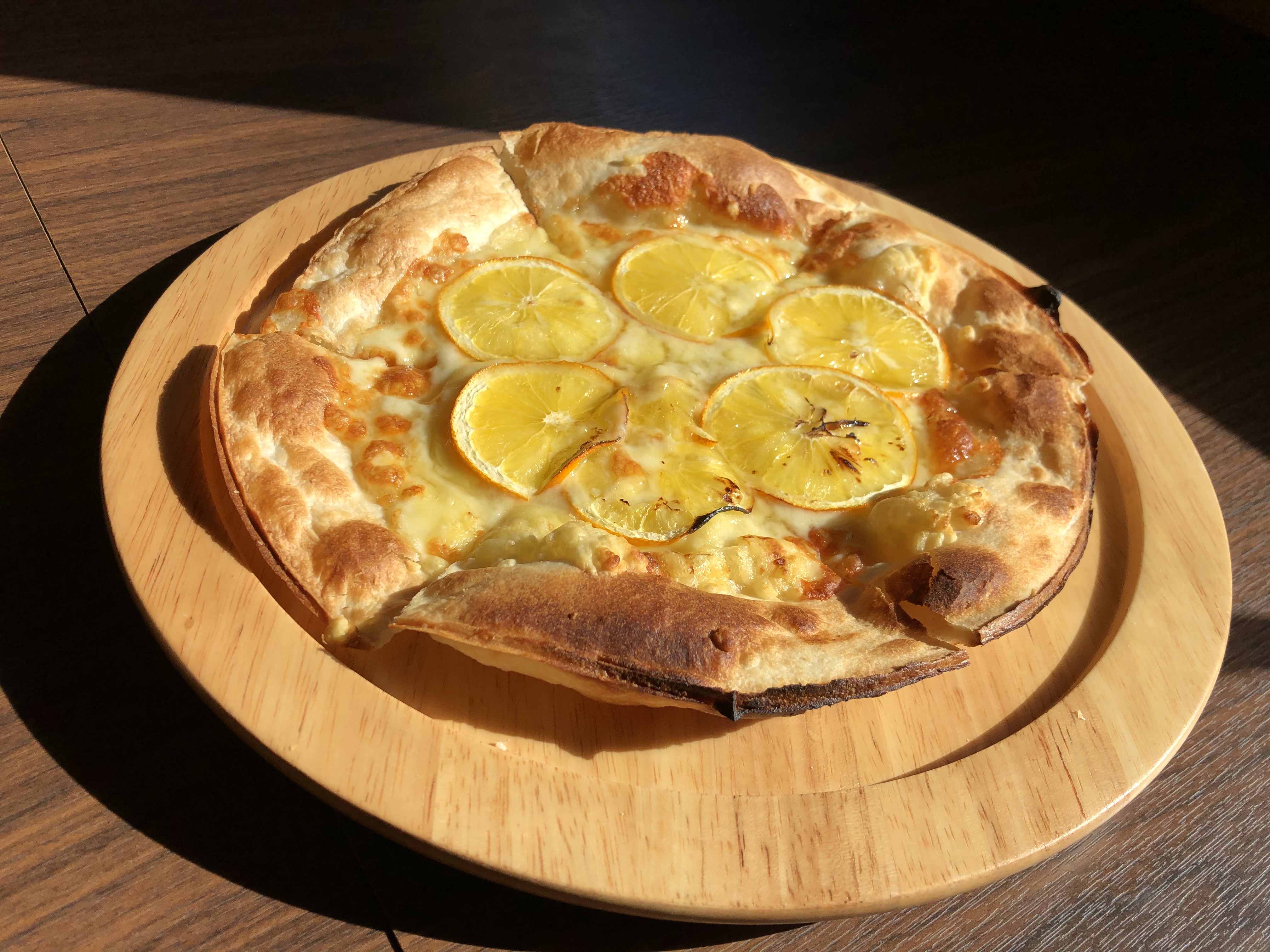 レモンピザ!!?となった方へ。大丈夫です。僕もなりました笑 レモンとピザって正直合うの?てか、レモンの皮もついている… 正直、味が未知すぎて想像ができません。いざ!実食じゃーーー!!