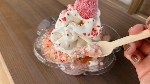 凍った苺が削ってあり、本当に花びらみたいで可愛いです。