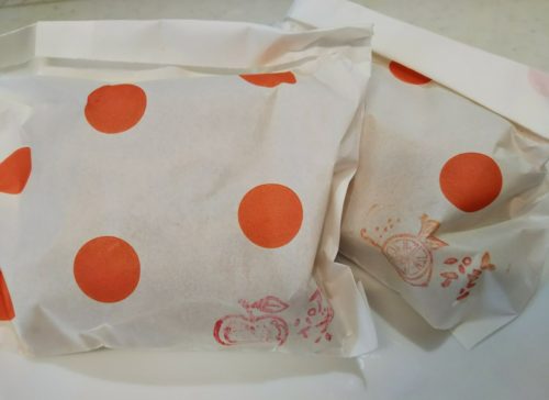 白生地にオレンジのドット柄がついた袋に入れて、中身が一目で分かるようにパイのスタンプが押されています。細かなところへの心配りが嬉しいです。