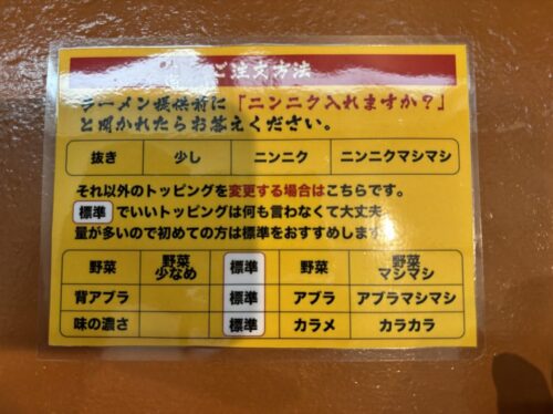 その際に「麺量」と「最初からラーメンにのっているトッピングの量」を伝えます。俗に言うコールというものですね。