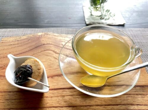 食後は、14種類のハーブをブレンドしたというアーユルヴェーダのハーブティーをいただきましたが、こちらもジンジャーやガランガルが効いていて、体があったまりましたよ。添えられていた米粉のクッキーとプルーンも嬉しい心遣いでした。