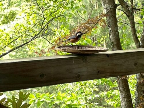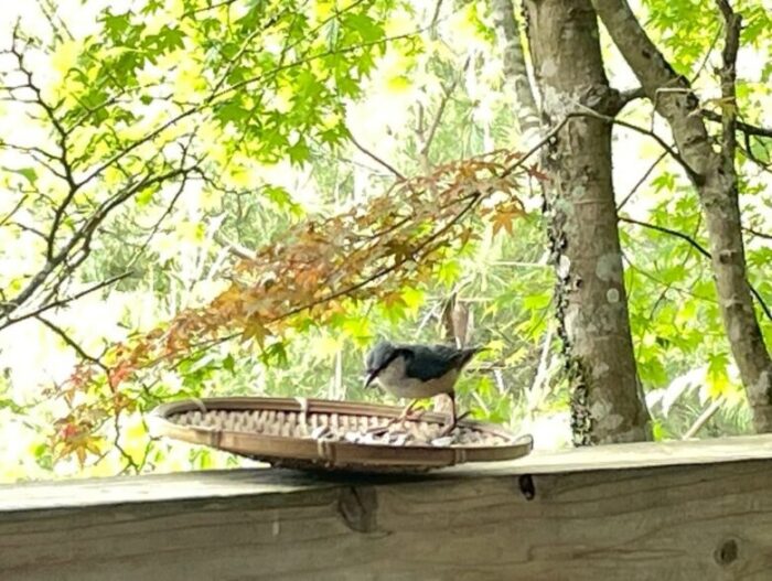 こちらのカフェのウッドデッキには、ひまわりの種が入った竹かごが置いてあり、見ていると頻繁に野鳥たちが遊びにきてくれます。