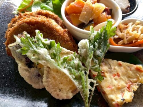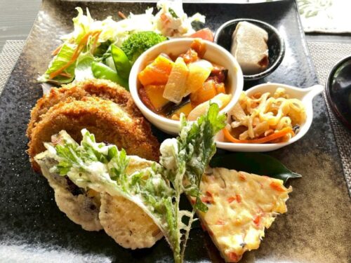 マヨネーズを使わないポテトサラダや、大根と人参の炒めなます、かぼちゃと人参とトマトのラタトゥイユ風、野菜たっぷり豆腐のキッシュ、車麩の唐揚げに、ナスとさつまいも、よもぎの天ぷら、自家製ごま豆腐など、野菜がたっぷり!