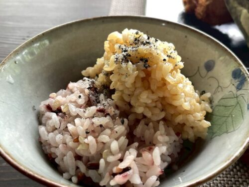 ご飯は、玄米と、赤米・黒米・緑米が入った分づき米の、嬉しい2種盛りで、おかわりもできますよ!