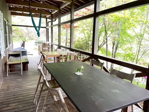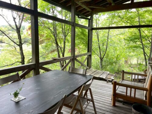 室内にもキッチンとテーブル席がありますが、リトリートするなら、全身の細胞で自然を感じられるこちらのテラス席が断然おすすめです。