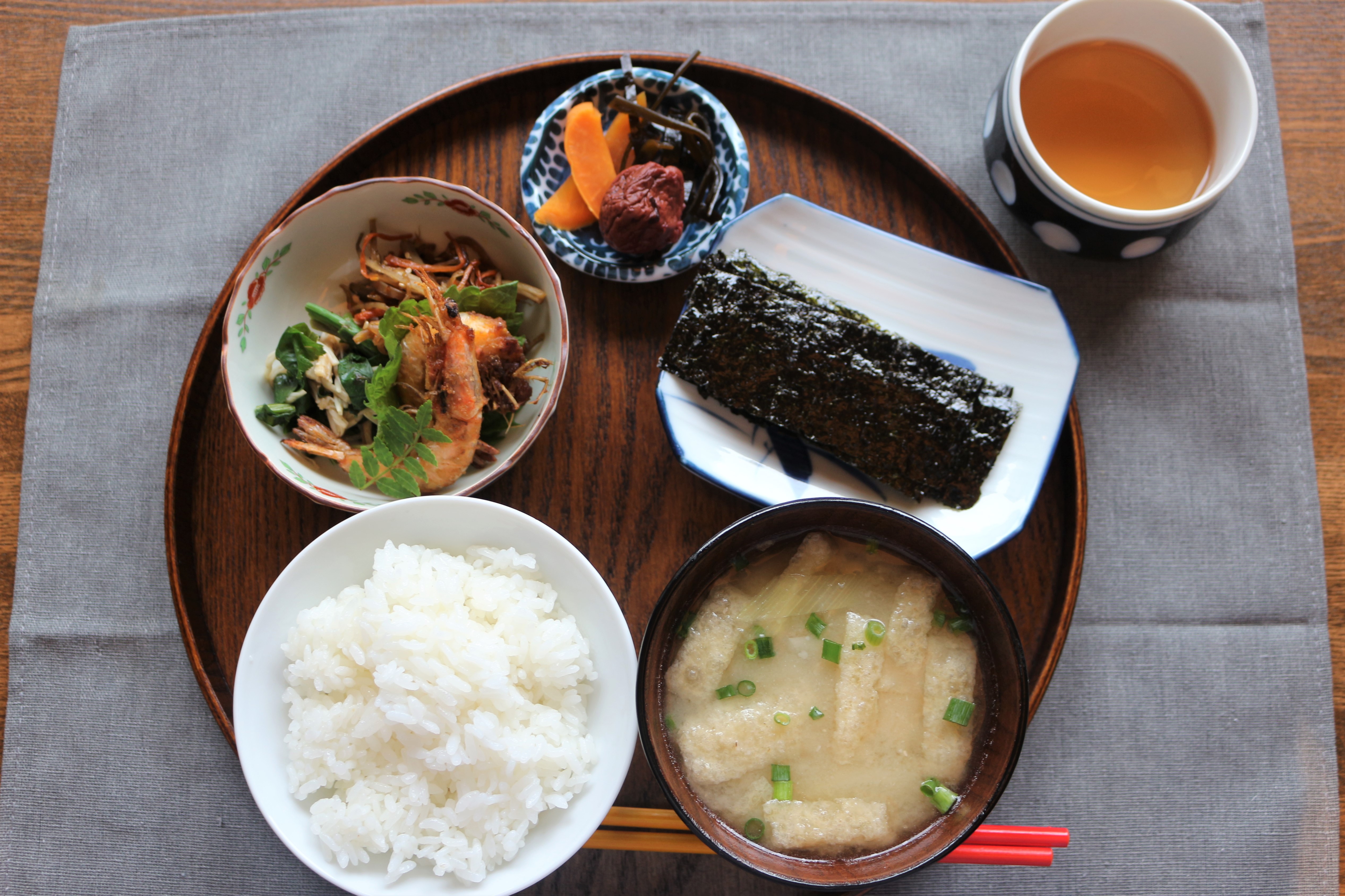 ごはん、みそ汁、小鉢、のり、漬け物、うめぼしがセットです。