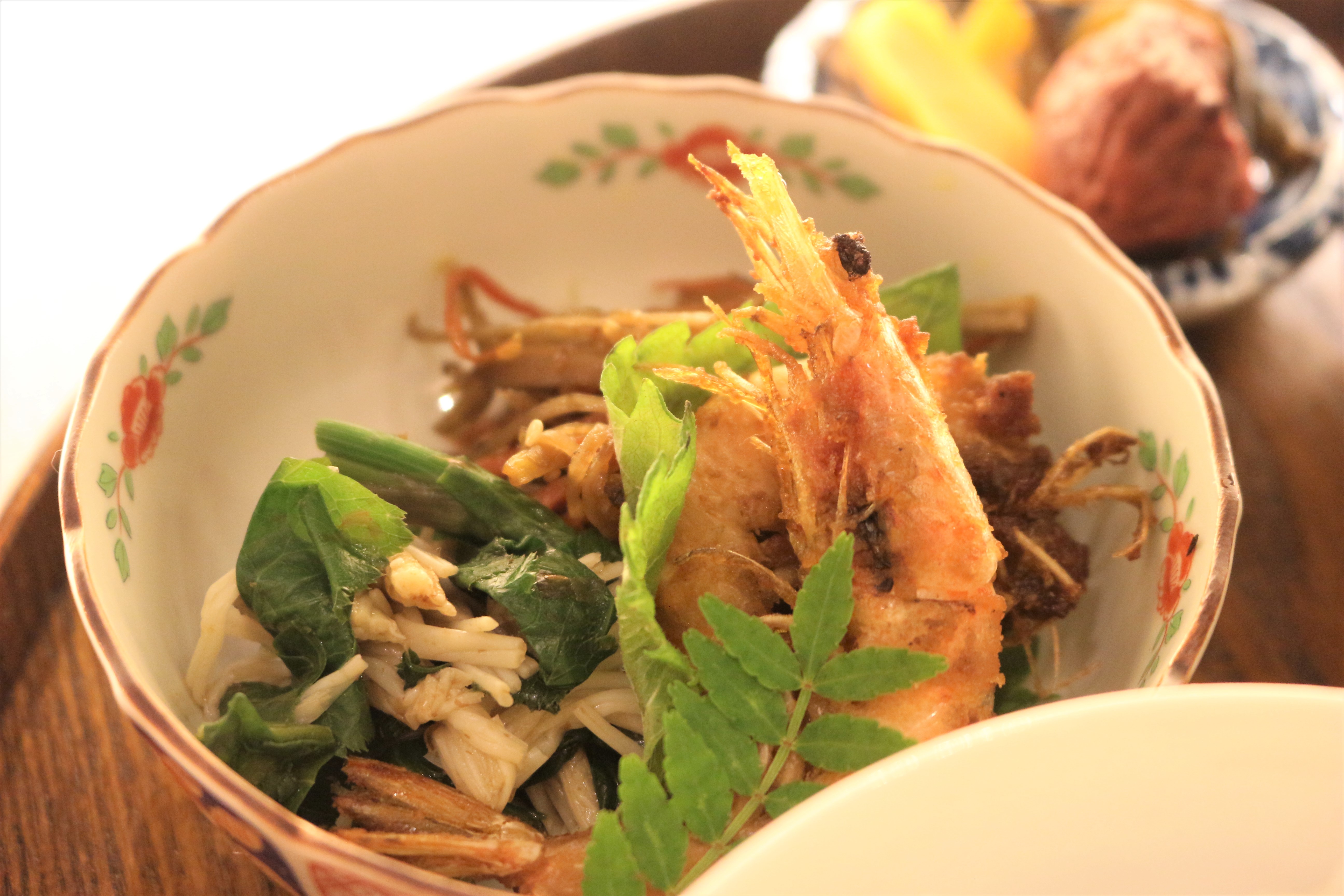 小鉢はこの中に3種類の日替わり惣菜が入っていました。この日は海老の唐揚げときんぴらごぼうとおひたし。ついついためいきがほっと吐息がこぼれます。あぁ美味しい。
