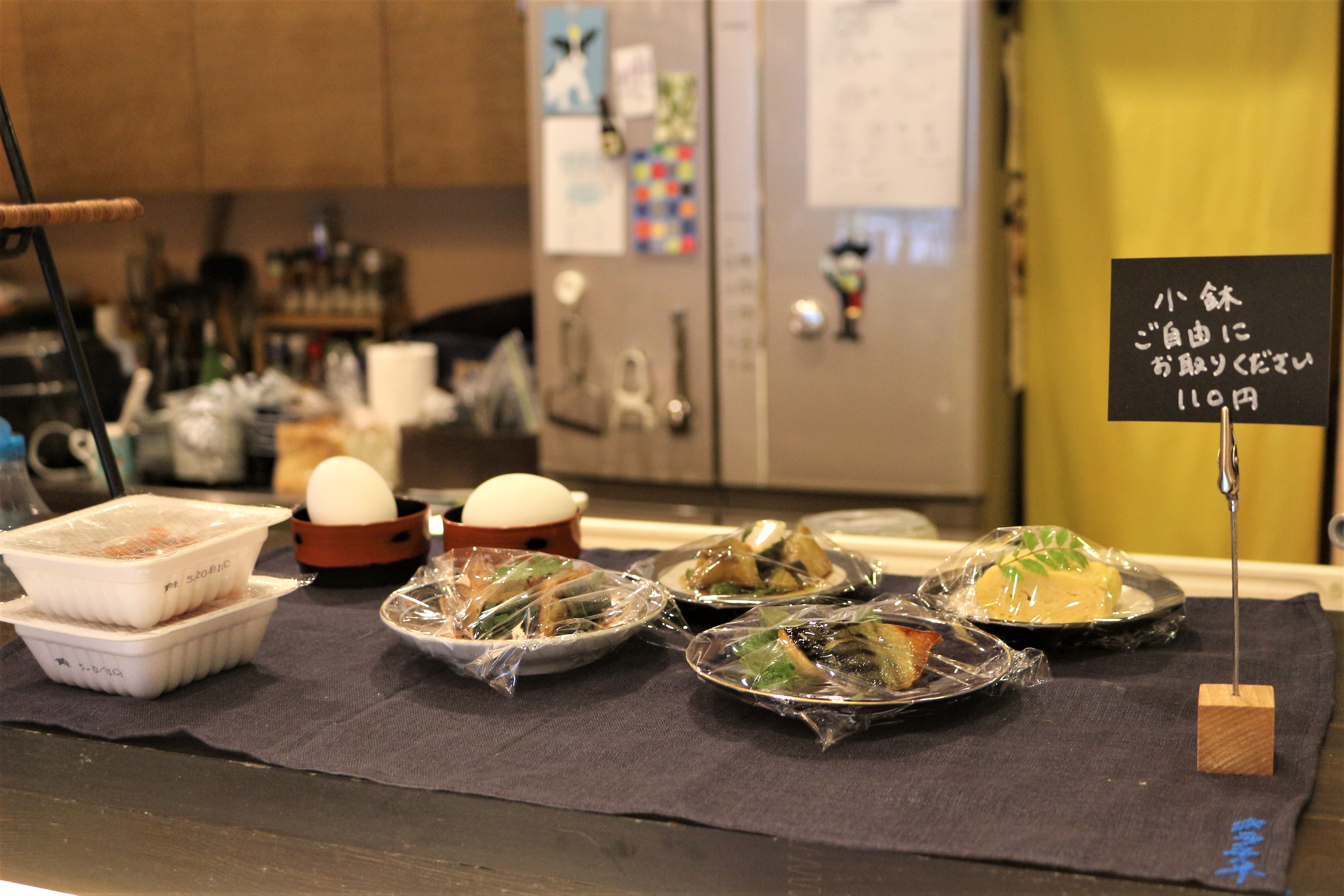 追加メニューの小鉢はカウンターの上に並んでいます。その日仕入れた食材によって内容が変わるので、いつ来ても違うメニューに出会えるそう。セットメニューに好きな総菜を追加して自分好みにバージョンアップしちゃいましょう。