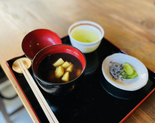 白玉と栗が入っており、箸休めの塩昆布とお漬物がぜんざいの甘さとおいしさを引き立てます。