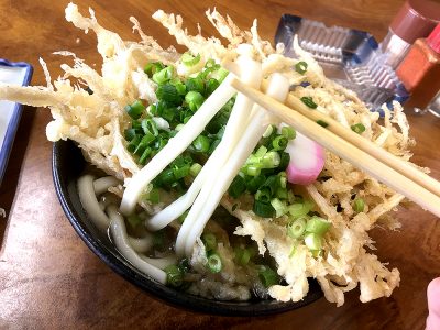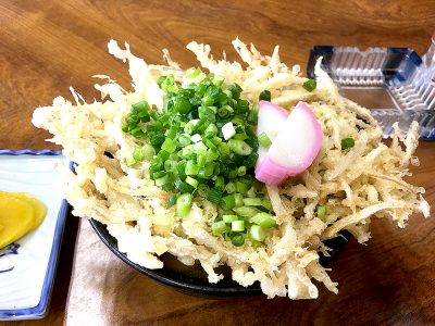 この巨大なゴボ天うどんがなんと一杯350円!田崎市場の皆さんのお袋の味!