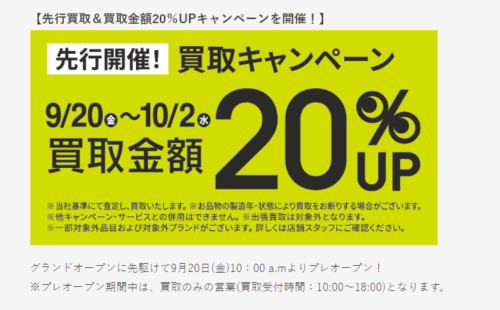 プレオープン中は買い取り金額20%アップ