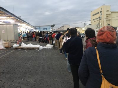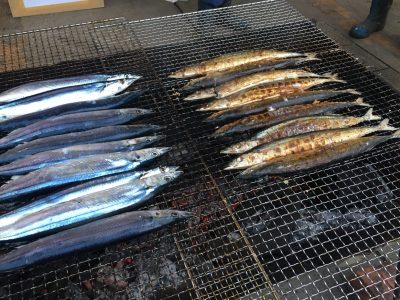 こちらはサンマの炭火焼きに並ぶ人達の行列です。私も限定1000匹のサンマが目当てだったので、並んでみました!