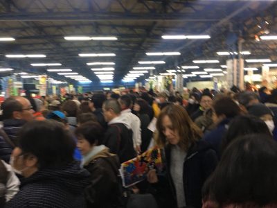 歩くのもやっとで、身動きがとれないほどの人混み。模擬セリや本マグロ解体ショーも行われました。