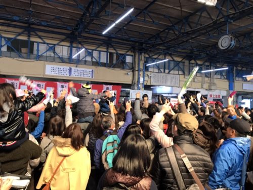 「はい!千円千円!!」と威勢のよいかけ声が響く中、子どもは肩車をしてもらい、お客さんたちも大きく手を上げ、なかには大根や白ネギを掲げる人も。ワーワーと活気ある声が飛び交い、市場ならではの風景が見られました。