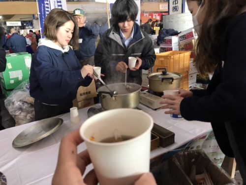 あったかいカニ汁や海鮮汁など、寒い時間帯には嬉しい汁物の販売もあり、お腹も満たせます。