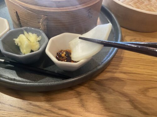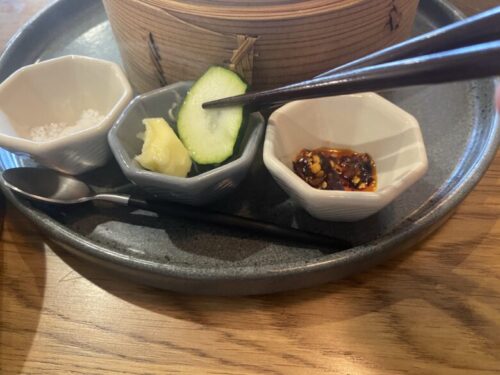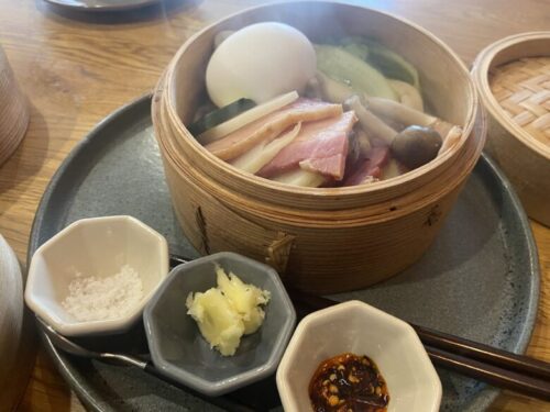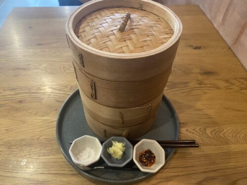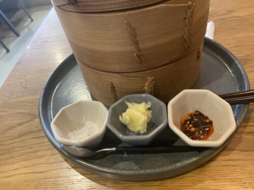 蒸篭の前には野菜やベーグルに付ける用の塩、バター、ラー油が並んでいます。