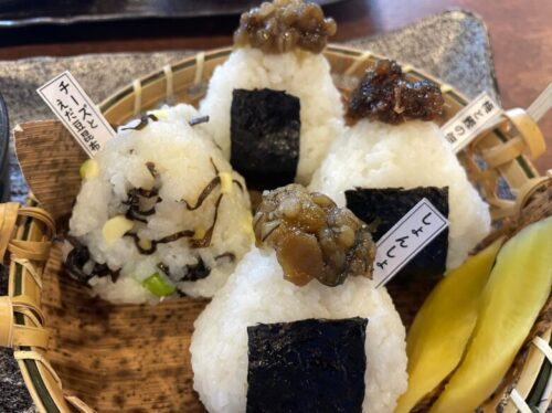 竹の皮が敷かれ、かごに盛られたおにぎりがかわいくて、しょんしょんやチーズと枝豆昆布など、バリエーションもいろいろ!