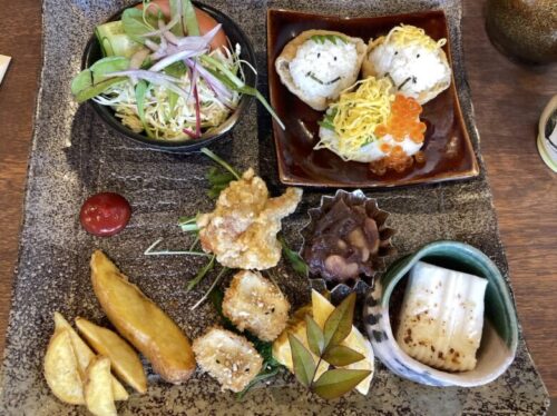 おにぎり4つに、唐揚げやポテト、サラダに玉子焼きなどがのった、大人のお子様ランチみたいに楽しいプレート!