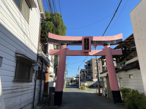 坪井、浄行寺交差点から少し西に立つ赤い鳥居。立田口大神宮の入口です。
