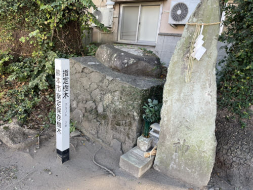 境内の3本の木は、熊本市の保存樹木。猿田彦大神の石碑もありました。