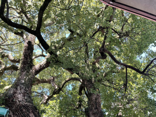 手前と奥にクスノキがあります。熊本市の保存樹木。