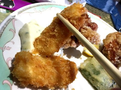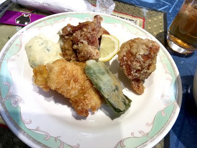 まずはお料理の方の鶏唐揚げ&イカフライが登場!ピーマン揚げも付いています。