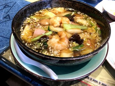 エビとかアジとかと悩みながら、結局食べたくなったのは王道メニュー「鶏唐揚げ」+「イカフライ」で、麺は、やはり中華と言えばあのとろみのある五目そばがそそられました。