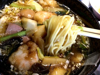 五目そばといえばストレートの細麺が一般的。コシがしっかりしていて、つるつると麺が違和感なく啜られていきます。美味い!これぞまさしく中華五目そば。