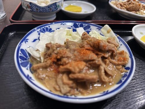 野菜たっぷり!!こちらの定食も、ラーメン定食と同じくホルモン、小鉢(ポテトサラダ)、白ご飯(小)、お漬物、のセットとなっております。