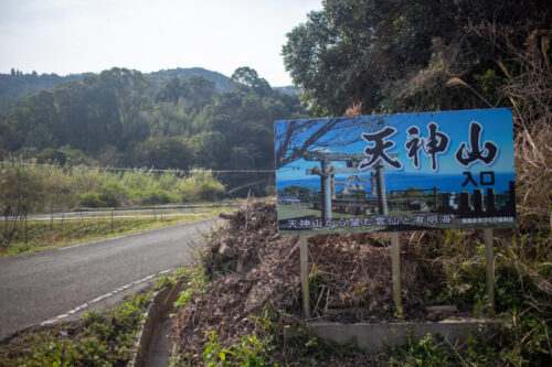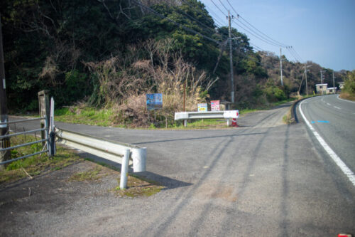 鬼池港から右手に海を見ながら走っていると、左手に海鮮蔵さんというお店がみえます。天神山への登り口は海鮮蔵さんの駐車場の隣です。