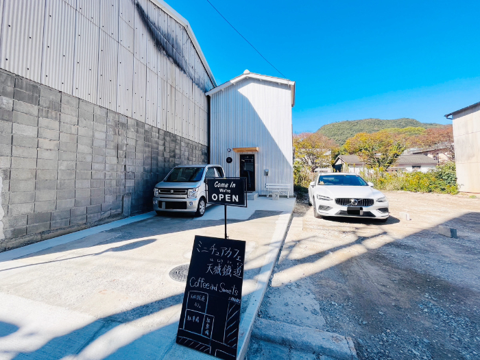 こちらがミニチュアカフェ「天城鐡道(てんじょうてつどう)」。スタイリッシュでお洒落な外観です。車は、お店の前と隣に敷地に停めて良いそうです。