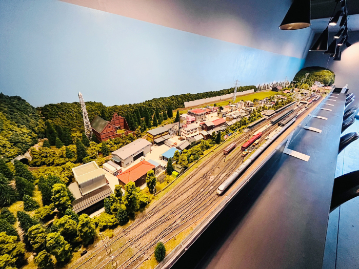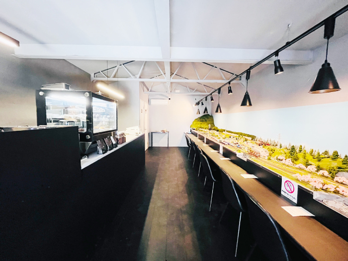 無機質でお洒落な空間に広がる鉄道模型がインパクト大なカフェです。見れば見るほど興味が出てくるほど、細かい設定の鉄道模型に子供から大人まで楽しめるスイーツ、コーヒーと沢山の魅力がありました。