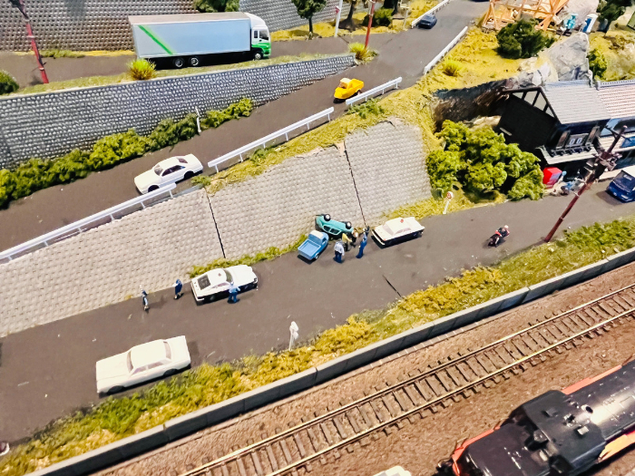 交通事故が起こっていたり。鉄道模型は1つ1つのパーツを組みあわせてこの空間を作りだすんだそう。なんと、この模型を作るには毎日作業して1ヶ月半~2ヶ月の時間が掛かっています。