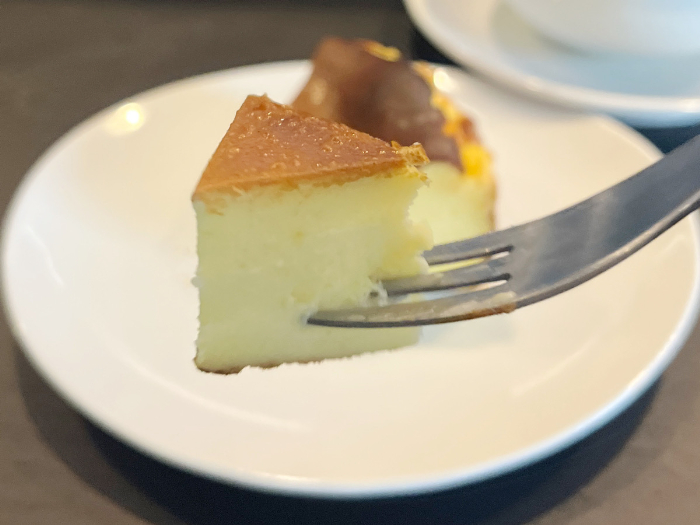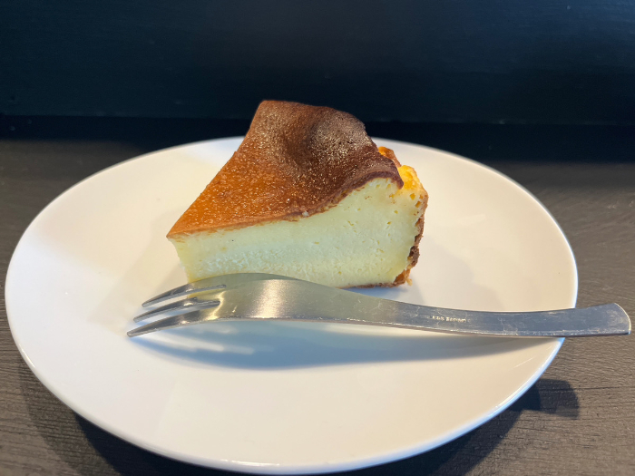 次にバスクチーズケーキを頂きました。このバスクチーズケーキは、生地の密度を高めるために牛乳、小麦粉、クリームチーズの配合にこだわり、さらにケーキのサイズまで計算されています。