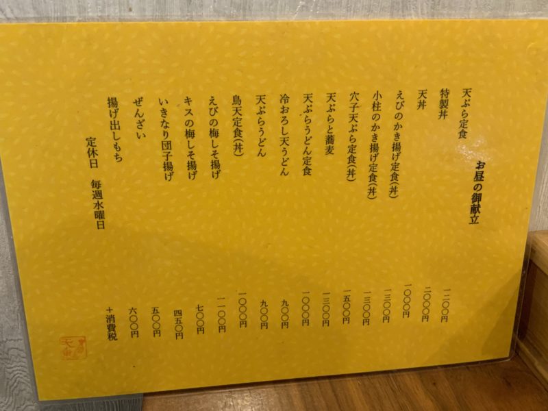 お昼のメニューは大体、1000円前後~。私にはちょっとリッチですが、本格的な天ぷら屋さんと考えればお手頃。