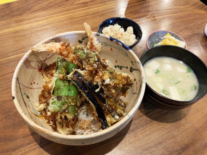 まずは天丼(税込1000円)。味噌汁におからと、お漬物が付いてきます。