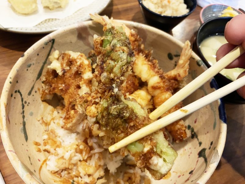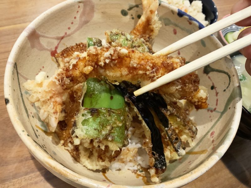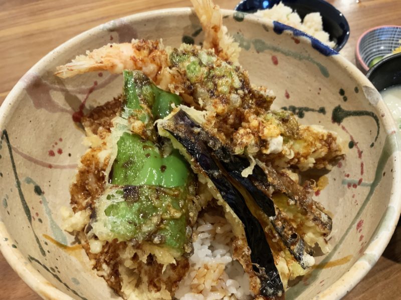 まずは天丼、2本の海老天と季節の野菜合わせて6種類が乗って、たれが染み込んでいます。