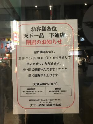 テレビでも度々取り上げられるラーメンの全国チェーン店「天下一品」。熊本には3店舗ありましたが、そのうち下通店が昨年12月30日に閉店しました。下通り界隈にラーメン屋は数多くありますが、アーケード内には意外と少なく、とても存在感のあるラーメン屋でした。現在は健軍店、南高江店の2店舗が営業中。