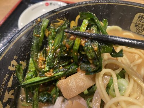 ニンニクの芽のガツンとした風味とまろやかな味噌、そして天下一品自慢の麺がしっかり絡み合います。
