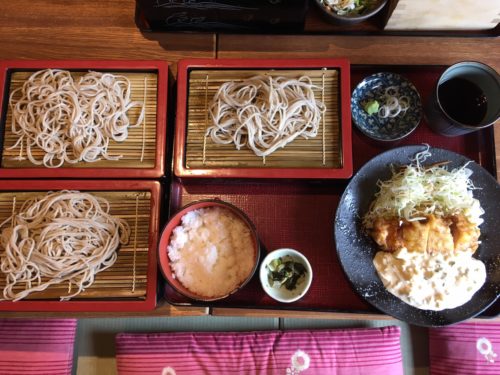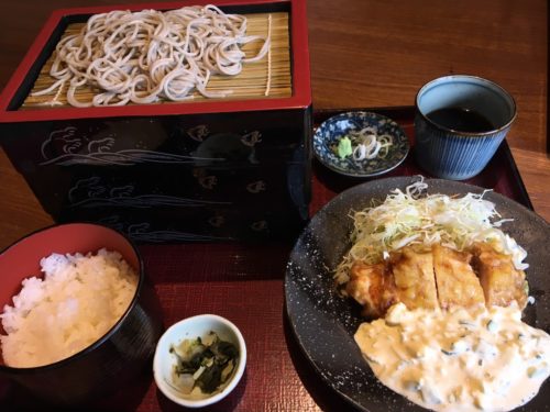 ランチメニューには自家製の十割蕎麦がついており、チキンカツと十割蕎麦、漬け丼と十割蕎麦など、バリエーションが豊富!蕎麦は3玉まで無料なので、チキン南蛮と十割蕎麦の定食を、欲張って蕎麦3玉で注文してみました。