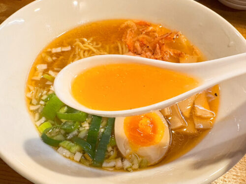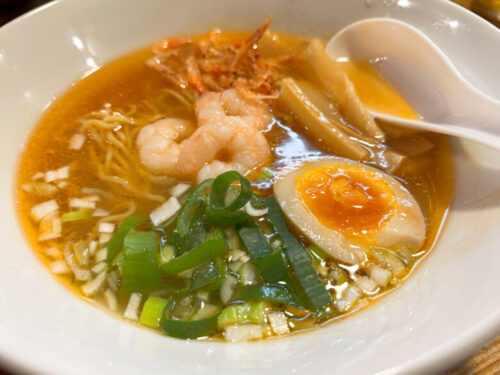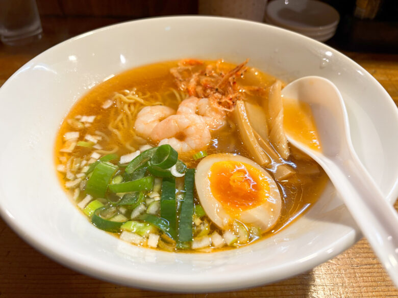 2種類のラーメンが楽しめます。今回頂いた海老塩ラーメンはスープに海老の旨味が濃く溶け出していて絶品でした。