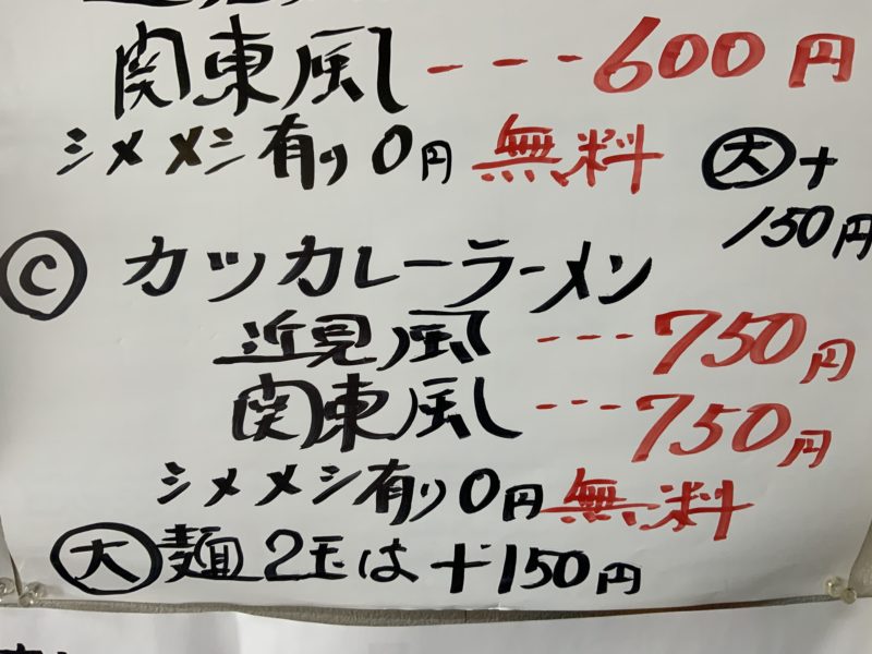 ここで気になったのが、「カツカレーラーメン」。近見風と関東風があって、どちらも750円。