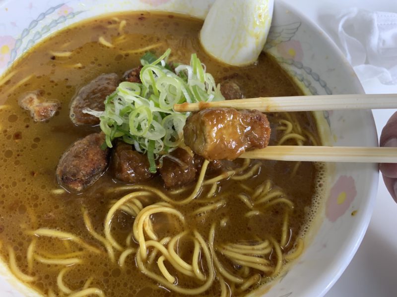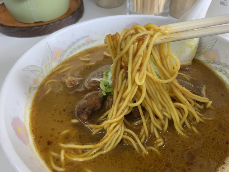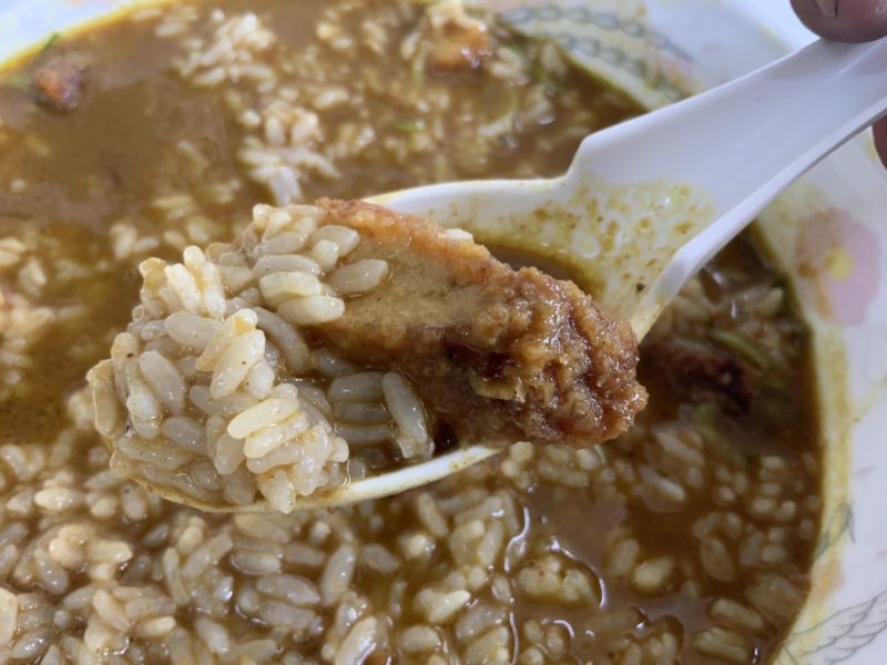 麺にもばっちりカレースープが絡まって激ウマ。最近流行りのスパイスカレーではなく、昔ながらの日本風カレーの味わい。