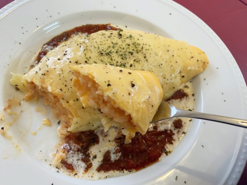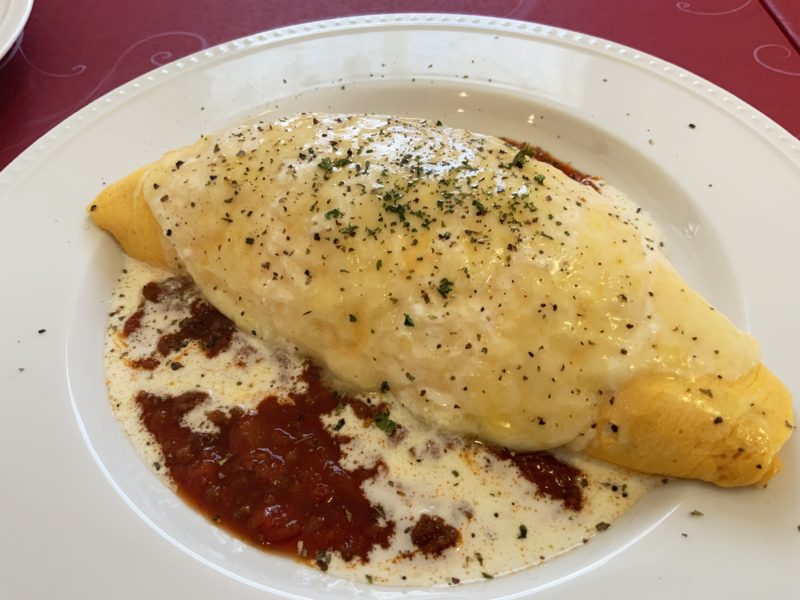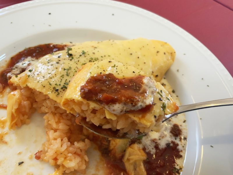 チキンライスをしっかり焼いた玉子で包み、自家製のミートソースと、チーズと生クリーム、バターのみで作ったチーズソースがかかっています。