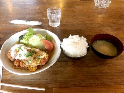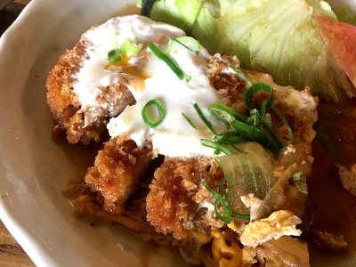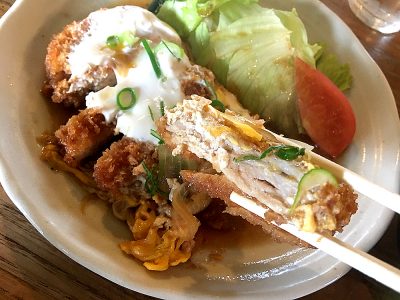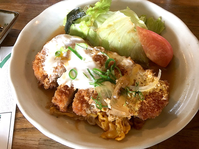 結構な厚みのとんかつに玉子とじをされており、ネギの振り方も絶妙。お供えのサラダもそれなりのボリュームがあり。